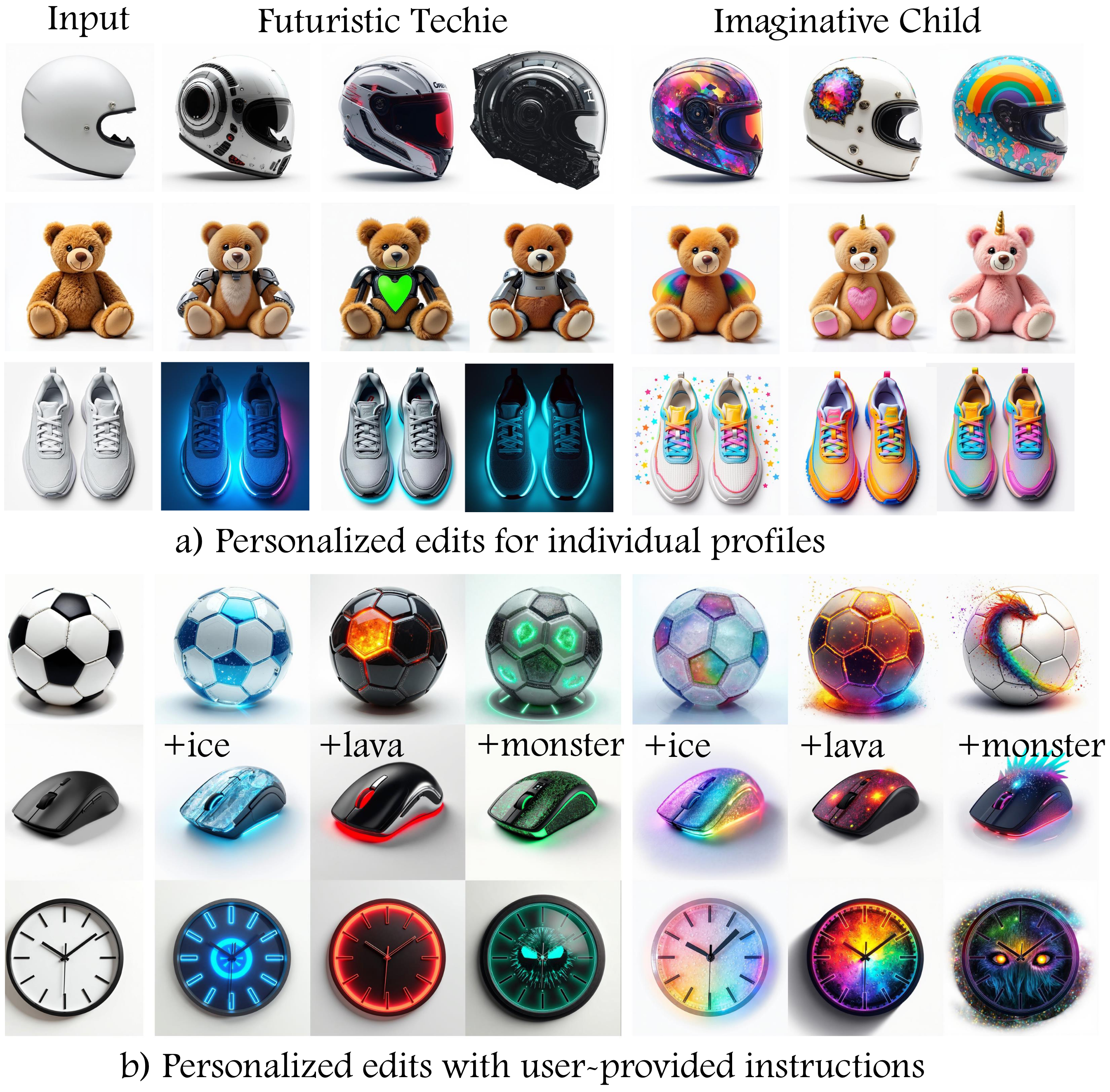 (a) Qualitative Results for Individual Users on Different Objects. Our framework is able to incorporate personalized elements into the image editing process, such as adding neon or futuristic elements for Futuristic Techie profile. (b) Qualitative Results for User-Provided Personalized Edits. Our framework allows users to provide additional guidance while performing personalized edits.