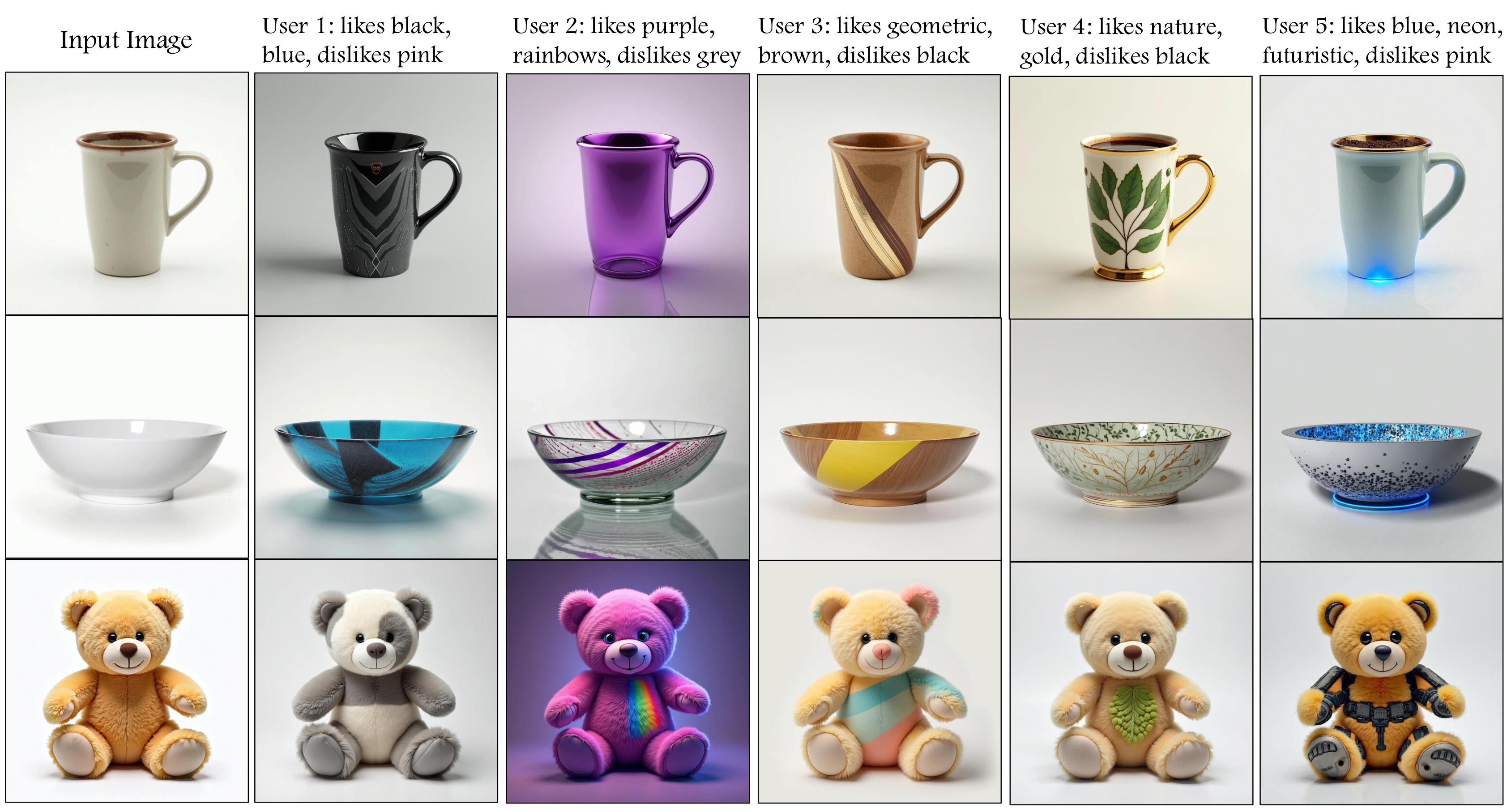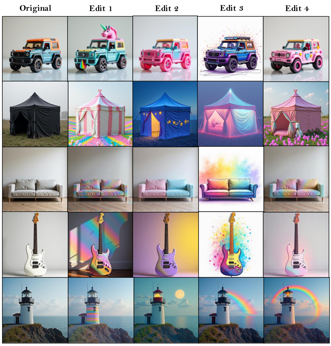 Qualitative Results for a Single User on Diverse Objects. For a user who loves unicorns, rainbows, and vibrant, playful palettes, our system infuses that whimsical aesthetic into a wide range of objects - from cars and guitars to watchtowers.
